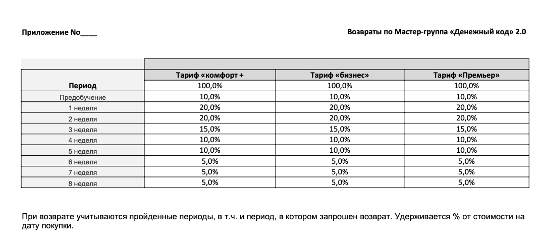 11.1. Возврат денежных средств осуществляется согласно приложению к настоящему Договору, а также в соответствии c действующим законодательством Российской Федерации.